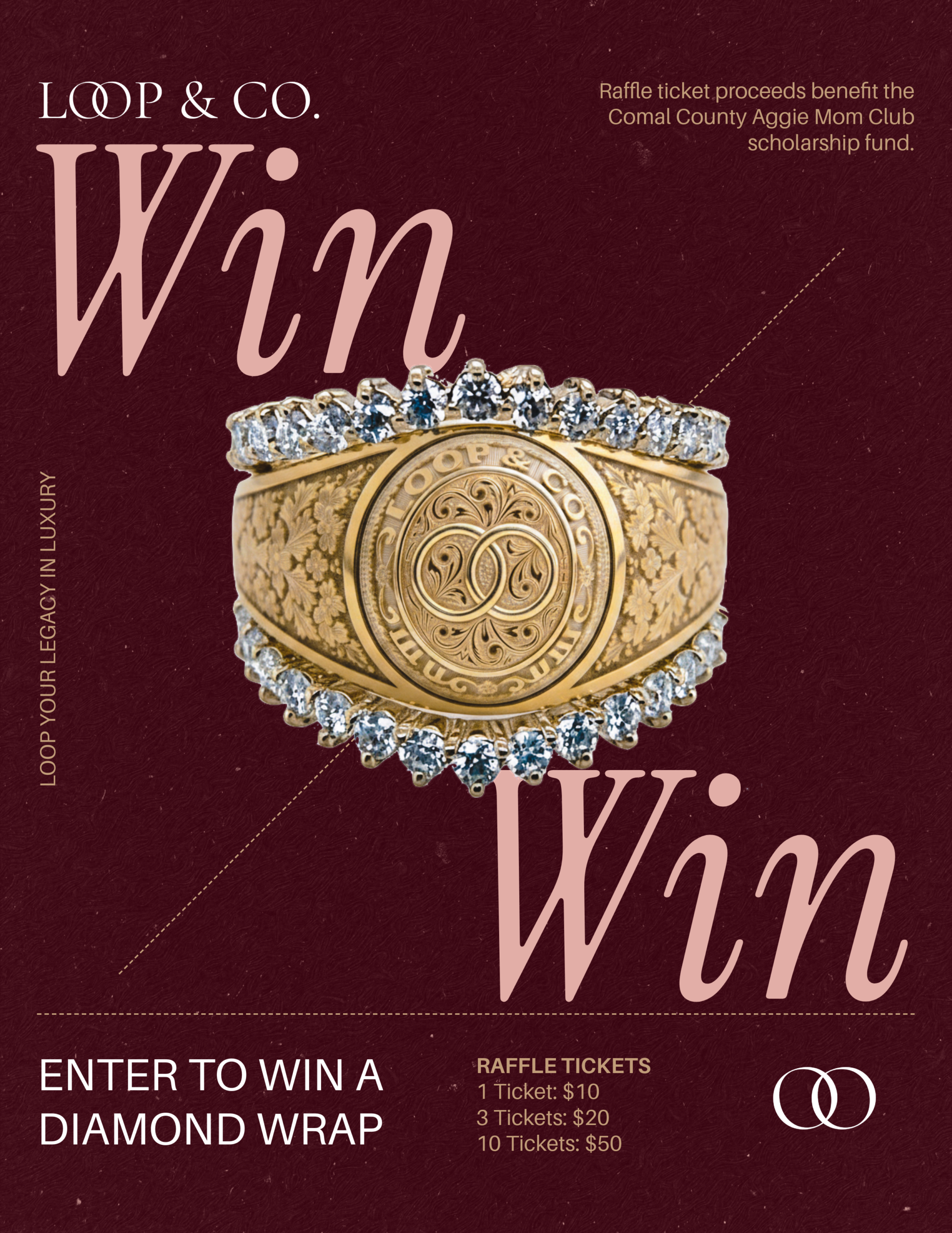 LOOP & CO. has graciously donated a diamond ring wrap valued at up to $2,399 for your 2026 Boutique Drawing. The drawing will be held immediately following the Aggie Mom Boutique on Saturday, April 11, 2026. You do not need to be present to when.
