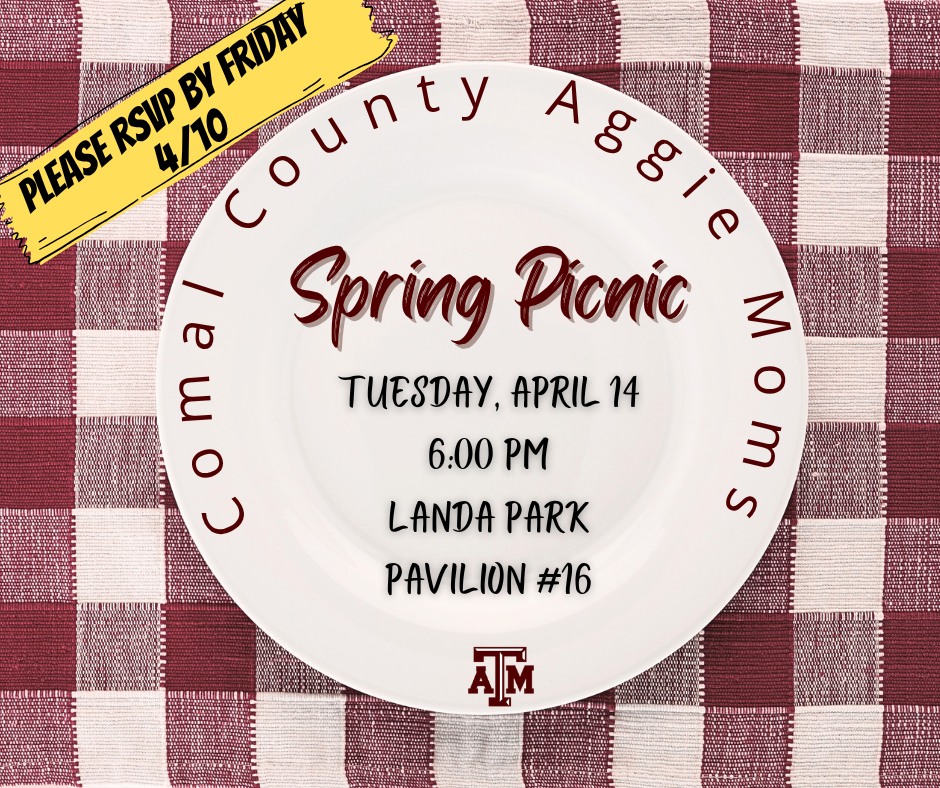 Comal County High School Seniors that will attend Texas A&M University in College Station or Galveston and their families are invited to join us for our Spring Picnic. We want to welcome you to the Aggie Family! There will be a fried chicken picnic, and we will announce our 2026 Scholarship Recipients. Please RSVP at the Spring Picnic event page on our Facebook page, or email our Social Chair at socialccam@aggiemoms.org.